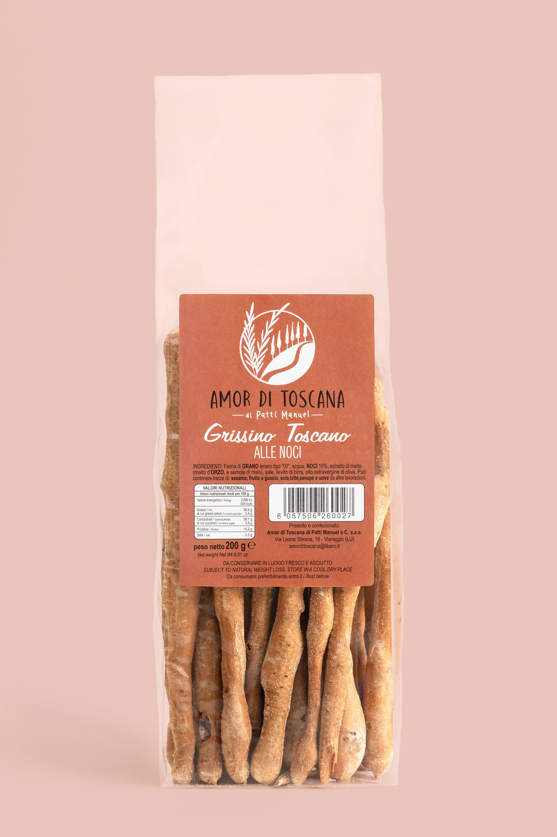 Ingredienti; Farina di GRANO tenero tipo "00",acqua,NOCI 10%, estratto di malto (malto d'orzo e semola di mais) sale, lievito di birra, olio extravergine di oliva. Può contenere tracce di SESAMO, FRUTTA GUSCIO ,SOIA,LATTE,SENAPE e UOVA da altre lavorazioni.